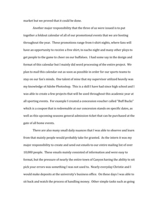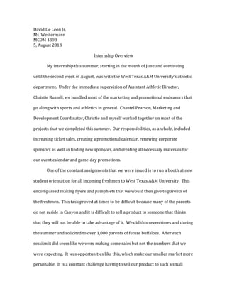 David De Leon Jr. interned with West Texas A&M University's athletic department over the summer under Assistant Athletic Director Christie Russell. His responsibilities included increasing ticket sales, creating promotional materials, and finding corporate sponsors. He helped at new student orientations, designed a promotional calendar, and utilized his Photoshop skills to create concession vouchers and tickets. Through tasks like sending emails, making deposits, and setting up at events, he gained experience and made connections across campus. The internship provided hands-on experience in sports marketing that he hopes to build on in his future career.
