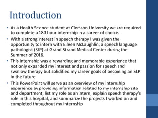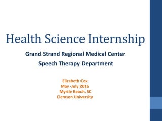 This document summarizes a health science internship completed at Grand Strand Regional Medical Center in the speech therapy department. The internship lasted from May to July 2016 and provided the intern with experience observing evaluations, treatments, and procedures. Through observing and assisting, the intern gained knowledge on common diagnoses and treatment approaches. The intern also completed various projects during the internship, including case studies, educational materials, and a study guide for future interns. The internship experience reinforced the intern's goal of becoming a speech language pathologist.