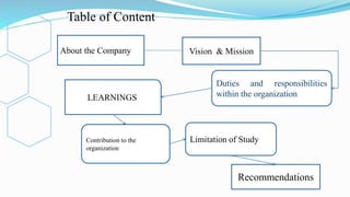 This document summarizes a summer internship project at an education and job placement company. The internship involved duties in marketing, business development, and general management. The intern learned skills in team management, client handling, time management, and gained industrial experience. The intern conducted research on the company's business development and customer retention strategies to attract and retain customers. Some limitations of the internship study included difficulties communicating with customers and officials due to time constraints. Recommendations include increasing promotions and revising lengthy recruitment policies.