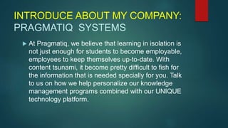 The document summarizes the internship presentation of Polireddy Gari Anugna at Pragmatiq Systems. The internship involved working on two real-time healthcare applications - Doctors-Reddy and Clinically mPower Health. Changes were made to both applications to improve functionality. The intern also worked on the Padho-Badho education application, making unspecified changes. Key skills learned during the internship included HTML, CSS, JavaScript, React JS, and AWS, as well as best practices for working with others in an office environment.