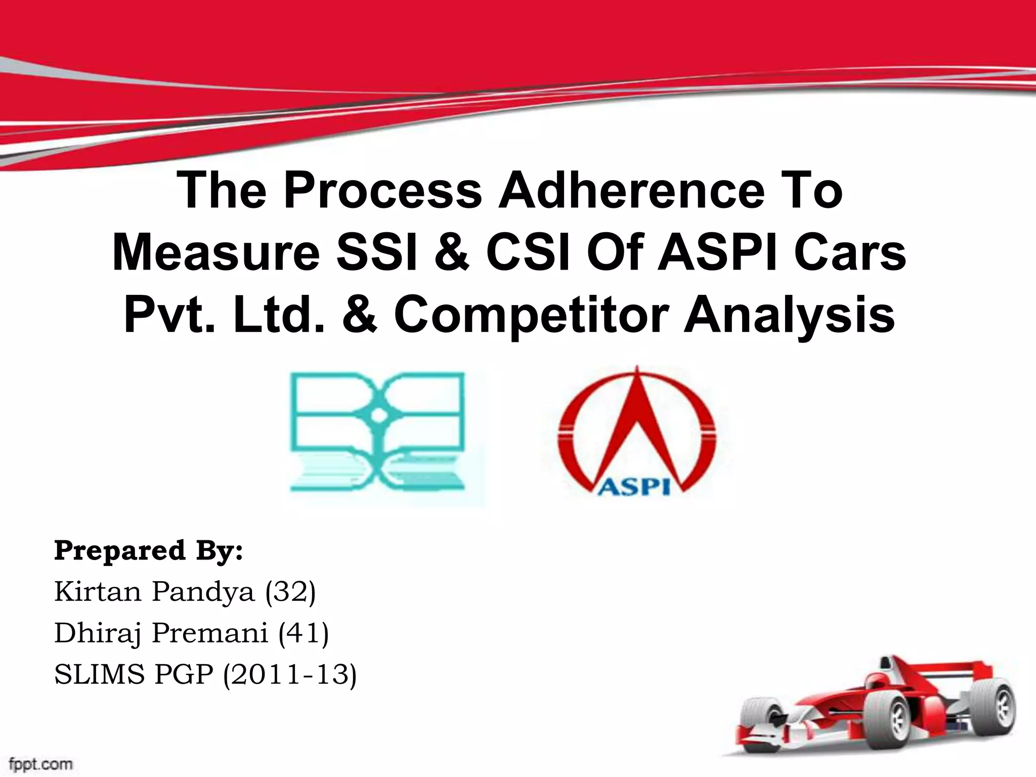 The document provides an analysis of ASPI Cars Pvt. Ltd. focusing on their sales and service processes, customer satisfaction indices (CSI) and sales satisfaction indices (SSI), and competitor analysis in the Indian automotive industry. It discusses the company's history, mission, and strategies to improve customer satisfaction and sales performance while highlighting issues such as customer service dissatisfaction and sales decline. The research includes findings from customer surveys and suggests areas for improvement in service quality, sales processes, and customer interaction.