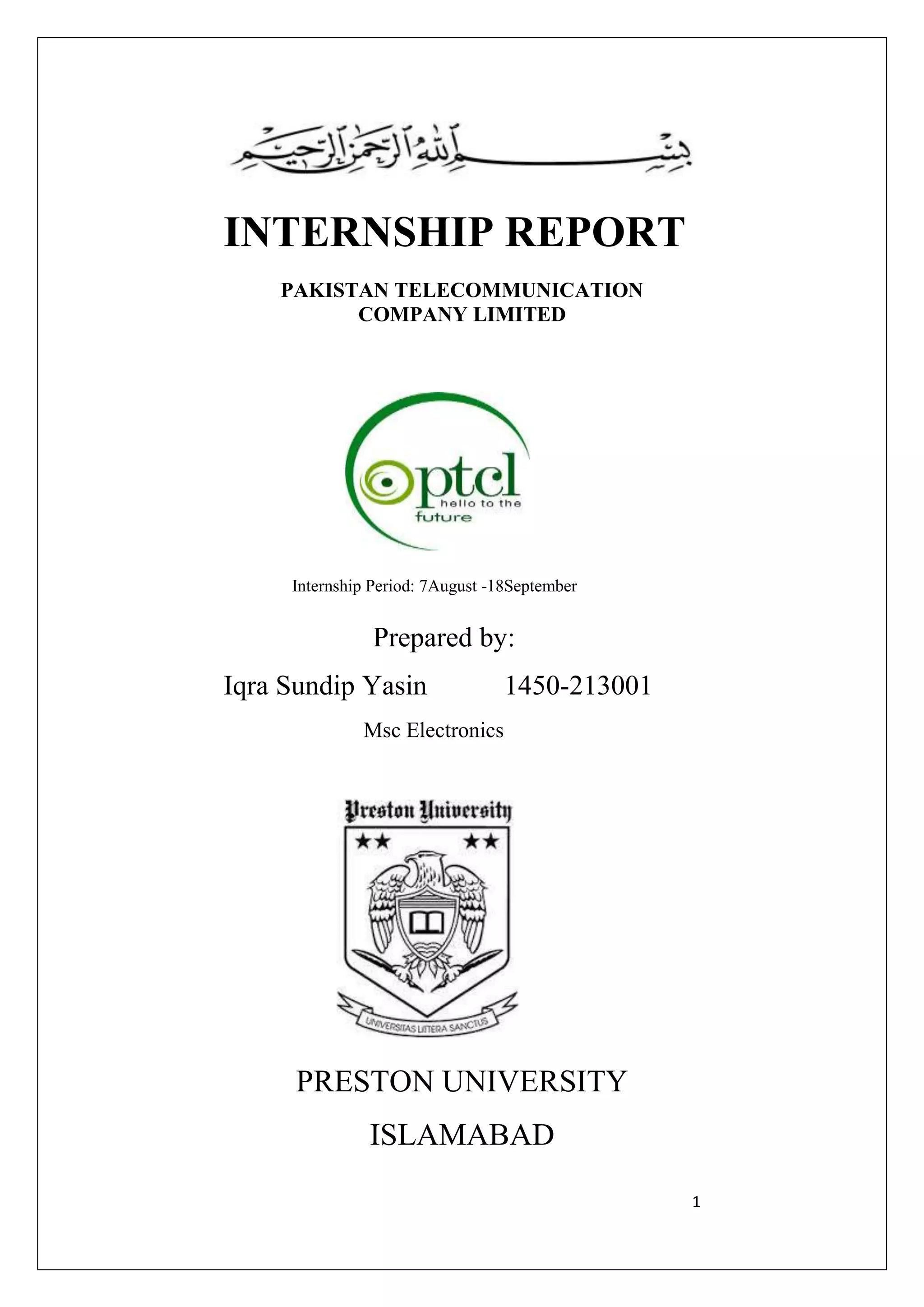 The document is an internship report detailing the author's experience at Pakistan Telecommunication Company Limited (PTCL) from August 7 to September 18. It covers the organization's history, structure, products, and the various switching technologies implemented, along with a description of the author's tasks during the internship. The report concludes with recommendations for PTCL to enhance its services and adapt to competitive market dynamics.