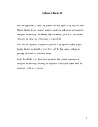 This document is an internship report summarizing the intern's experience working at First Capital Equities Limited (FCEL) over a two month period. It provides an introduction to FCEL, describing its history, organizational structure, departments, services, and the intern's responsibilities.