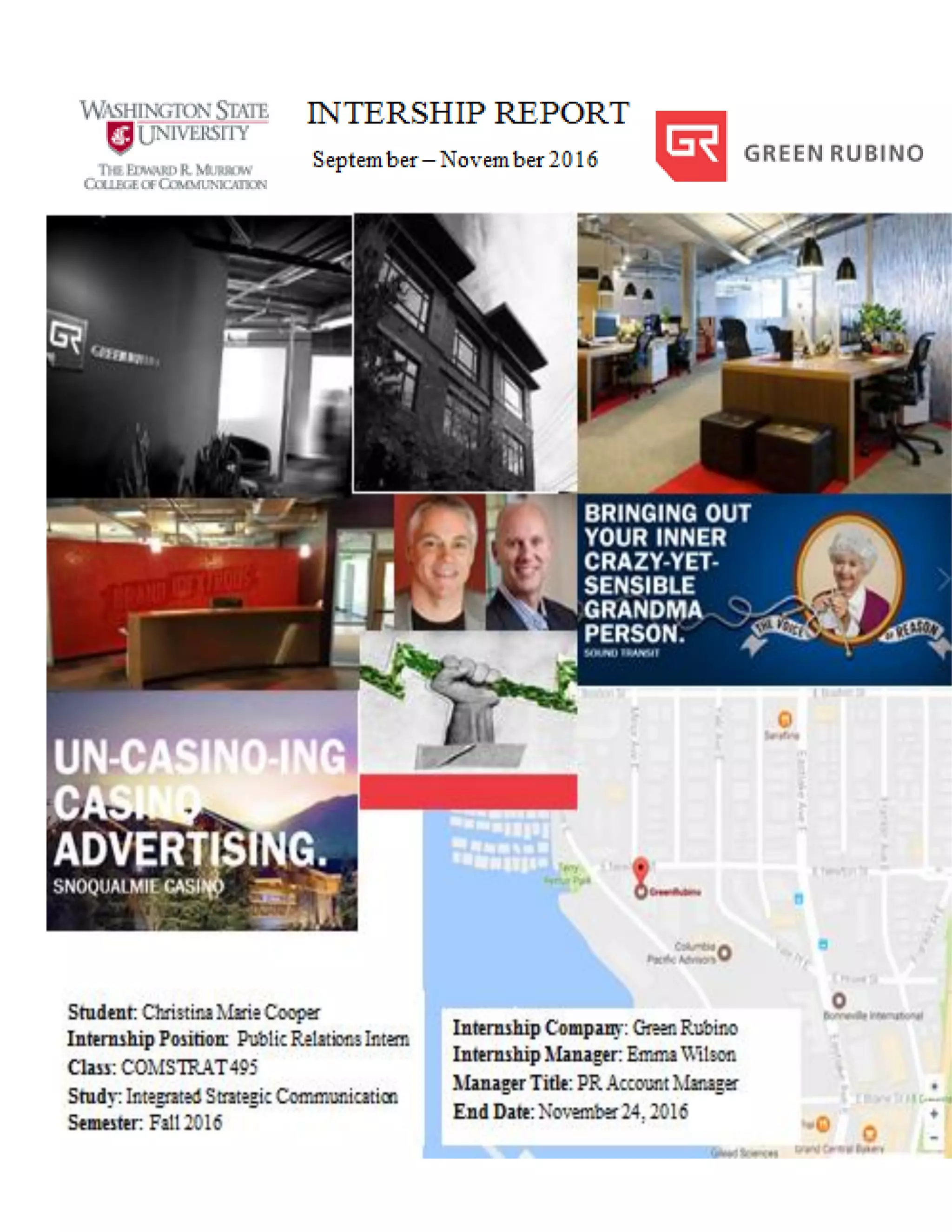 GreenRubino is a full-service marketing agency based in Seattle that specializes in branding, advertising, public relations, digital marketing, and social media. It has several departments, including branding, advertising, media, digital, public relations, and social media. The agency serves clients in various industries such as food, travel, wine/beer, lifestyle, and consumer products. It was established in 1997 and has created marketing strategies and campaigns for multiple well-known clients. The intern will be working in the public relations department, which consists of managers, coordinators, and another intern, to gain hands-on experience in communications work.