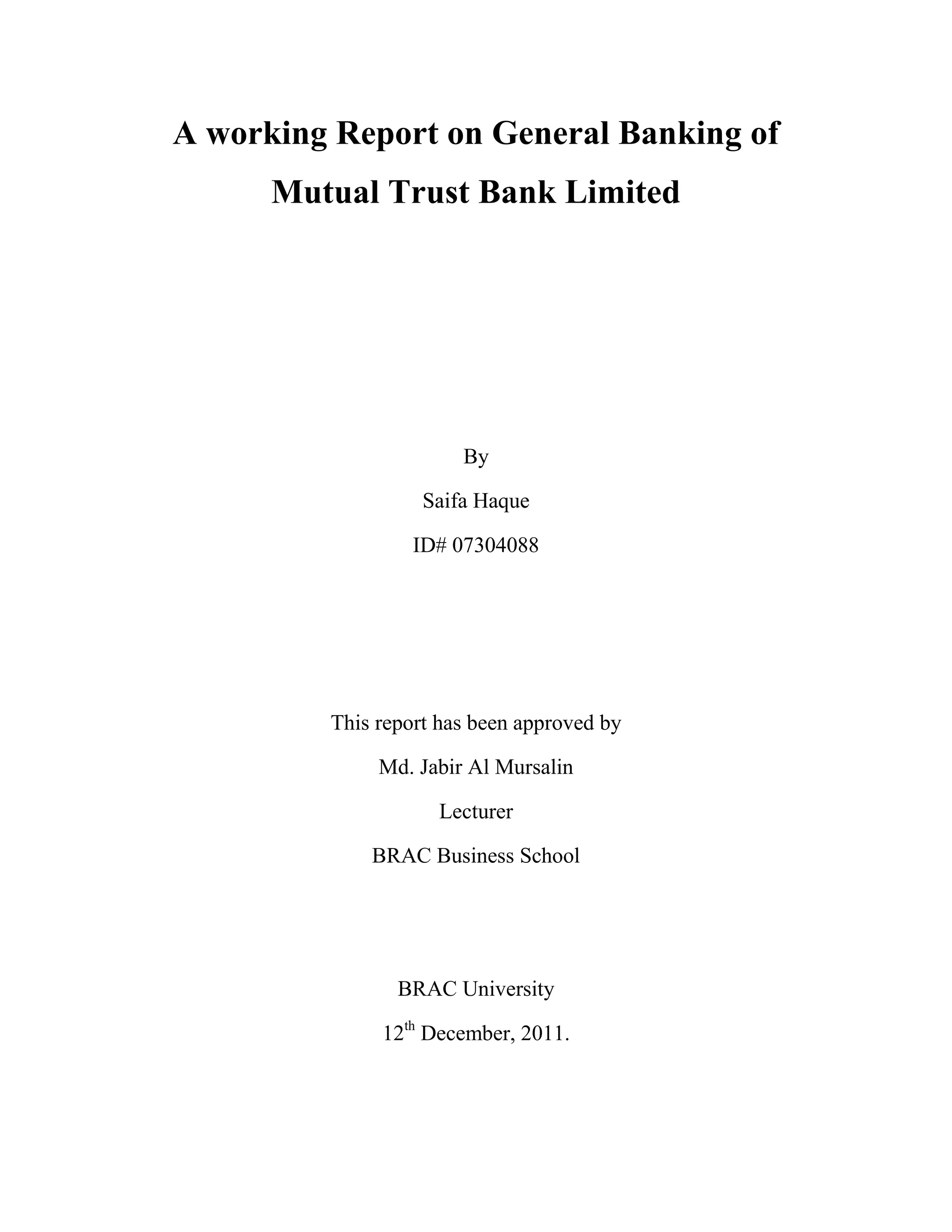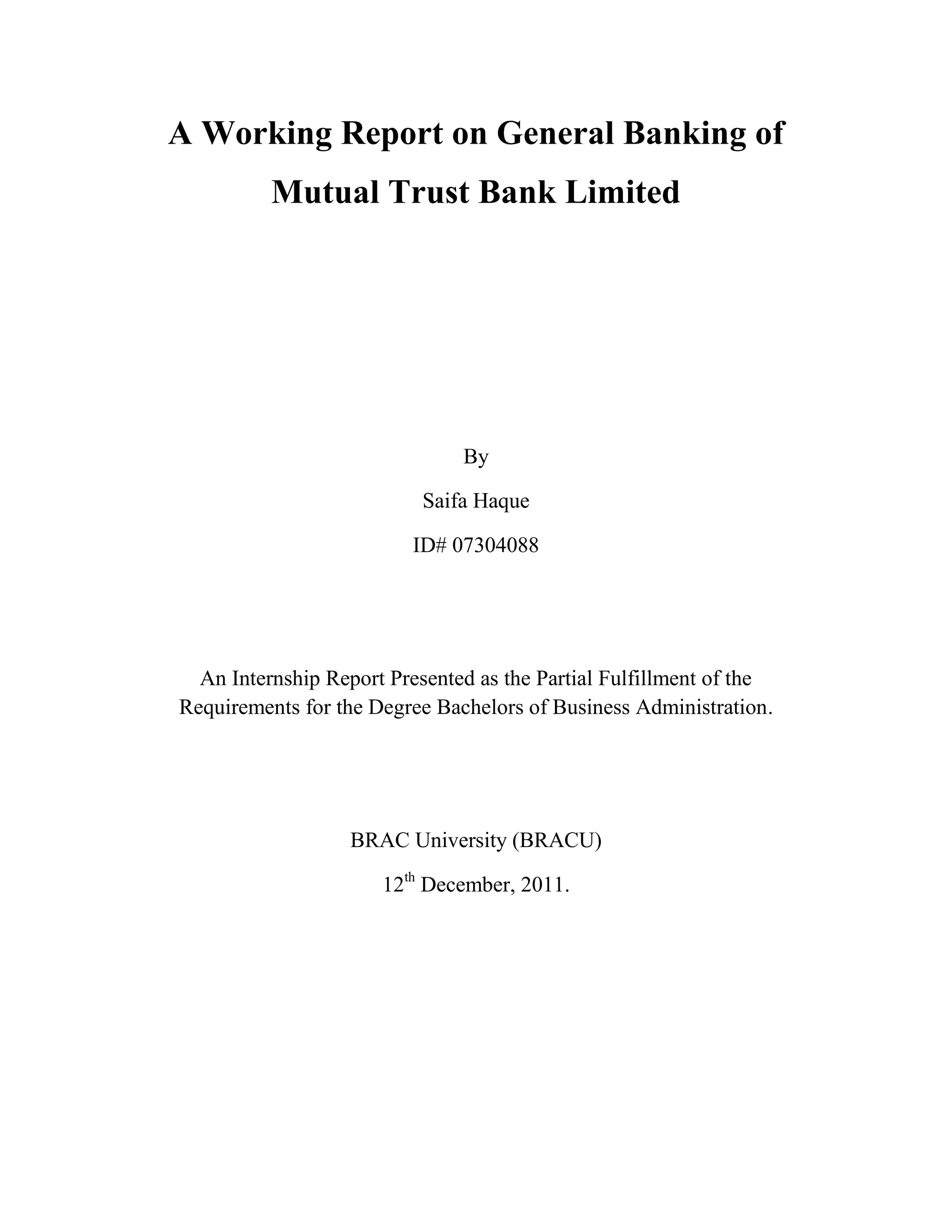 The document is an internship report on the general banking operations of Mutual Trust Bank Limited by Saifa Haque, submitted as part of the Bachelor of Business Administration program at BRAC University. It outlines the bank's services, including various consumer banking products, account management procedures, and the structure of its general banking department at the Panthapath branch. Additionally, it highlights the author's learning experiences and the challenges faced during the internship, while showcasing the bank's objectives and operational methodologies.