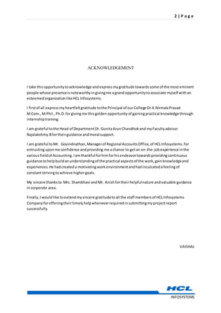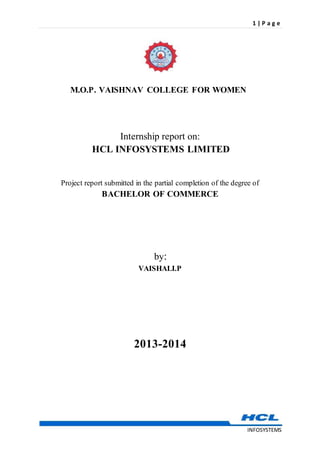 The internship report outlines Vaishali P.'s experience with HCL Infosystems as part of her Bachelor of Commerce degree. It acknowledges the support of mentors and the organizational structure of HCL, which utilizes various departmentalizations to optimize functions in accounting and customer service. Additionally, the report provides a brief history and profile of HCL Infosystems, emphasizing their innovation in technology and customer-centric approach since its founding in 1976.