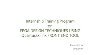 The document details an internship training program focused on FPGA design techniques using Quartus and Xilinx, aiming to provide engineering students with practical experience and enhance their career opportunities in VLSI. It covers the fundamentals of VLSI design, fabrication processes, and various applications across multiple industries including telecommunications, automotive, and healthcare. Additionally, it outlines India's growing semiconductor sector with new manufacturing facilities and lists major IC fabrication companies.