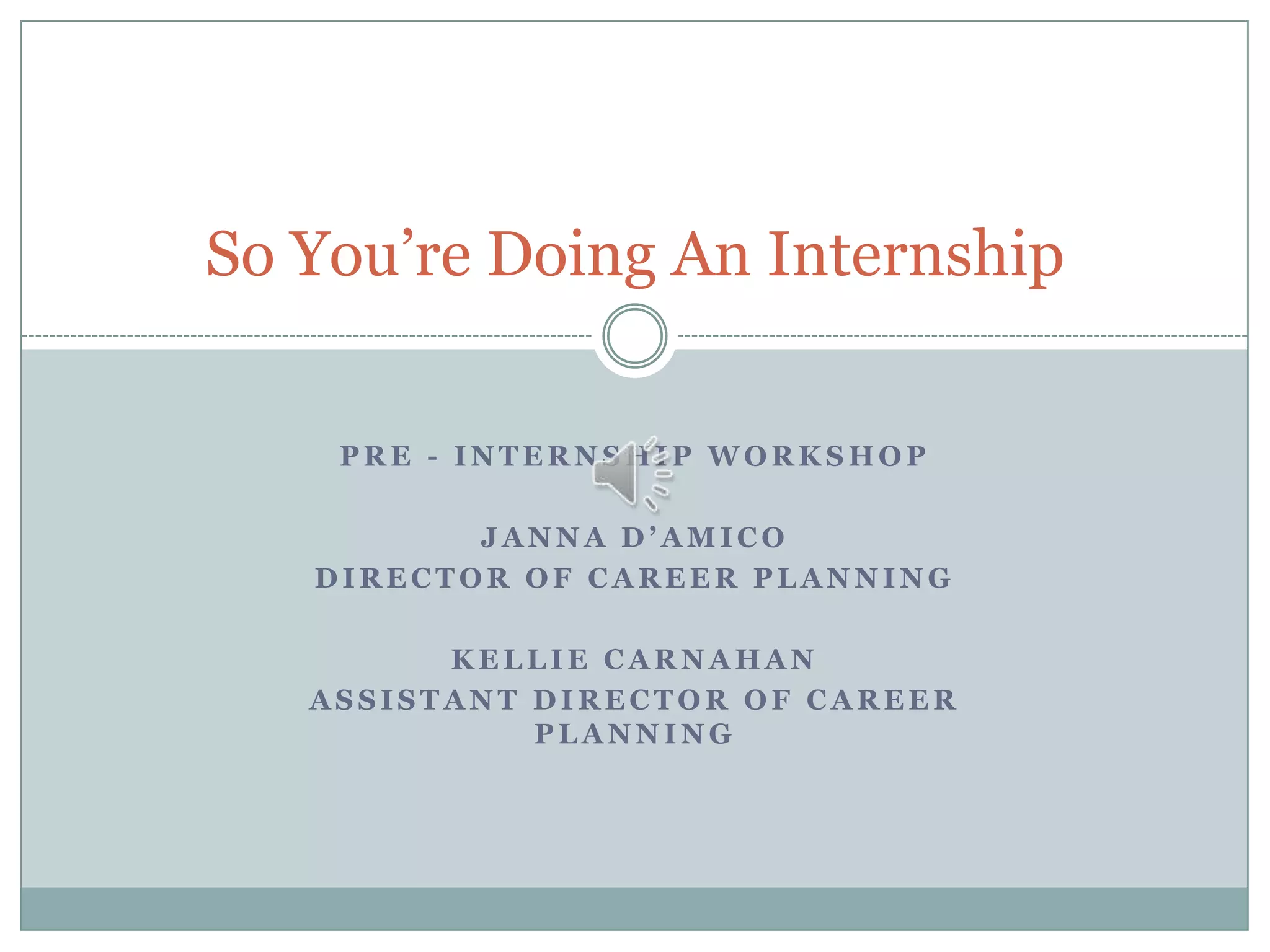 This document provides guidance for students completing internships. It outlines the internship process, including maintaining contact with a faculty sponsor and completing a minimum number of hours. Students are advised to set goals, follow professional standards of dress and conduct, and take initiative during their internship through tasks like asking questions, offering help, networking, and keeping records. The document also addresses addressing any problems and provides contacts for career advisors.