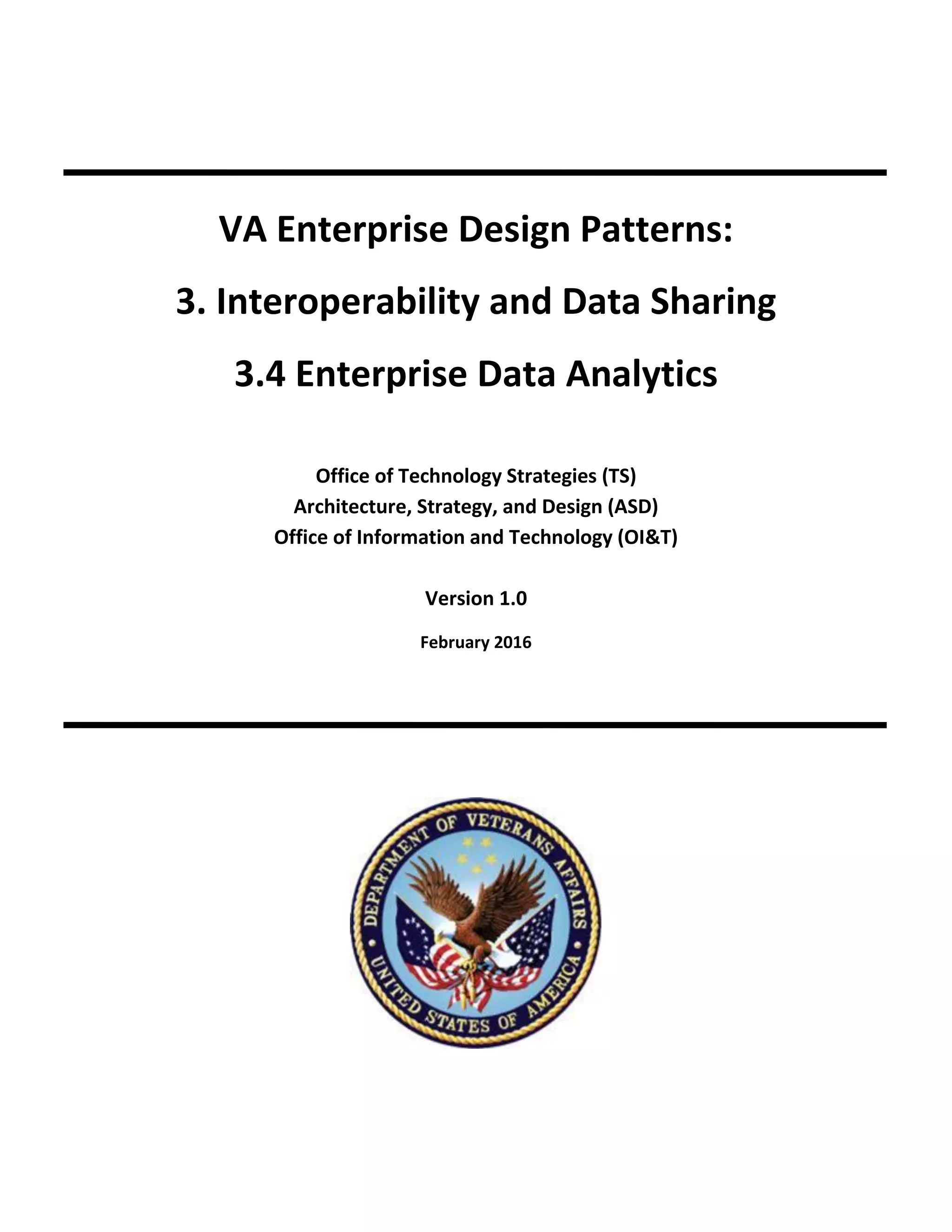 This document outlines VA's plans to improve enterprise data analytics capabilities. It discusses establishing governance roles and policies to oversee analytics, integrating siloed data sources into a unified ecosystem, and adopting technologies like data warehouses and analytic frameworks. The goal is to enable more advanced analytics that combine clinical and operational data to improve outcomes. Examples include streamlining disability applications using predictive models and triggering special care based on patient data changes.