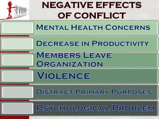 This document discusses types of conflict that can occur within organizations. It identifies intrapersonal conflict, interpersonal conflict, and intergroup conflict. Intrapersonal conflict occurs when a leader assigns conflicting missions to members. Interpersonal conflict is a serious problem that affects people emotionally. Intergroup conflict arises from differences between groups. The document also lists some common causes of organizational conflict, including organizational change, differing values and threats to status. While conflict can have negative impacts like resistance to change, it can also spur creativity when resolved constructively.
