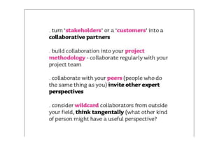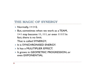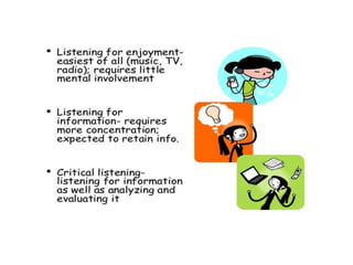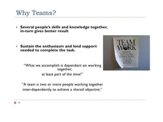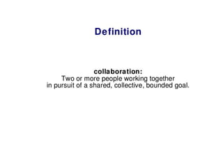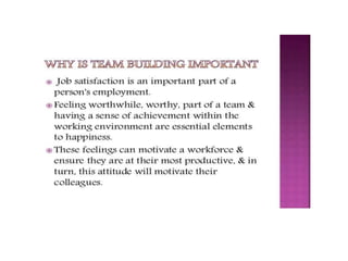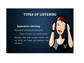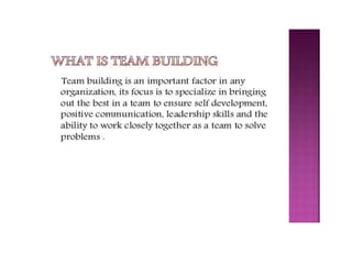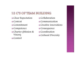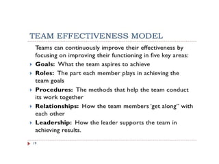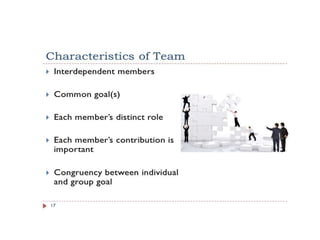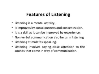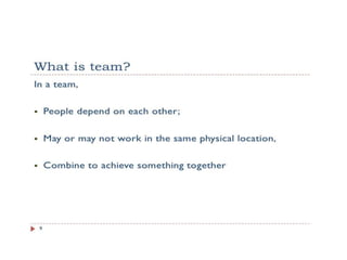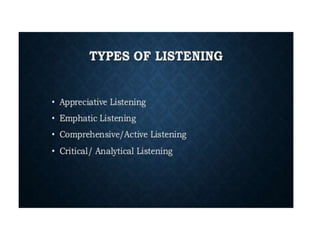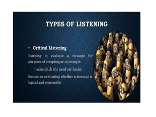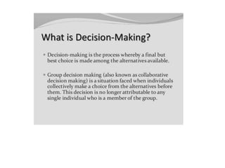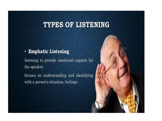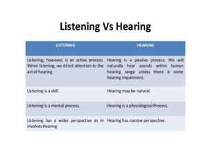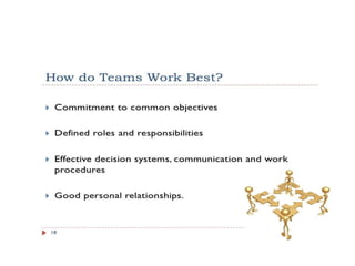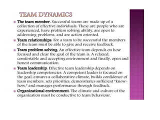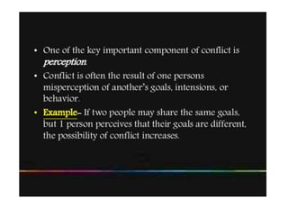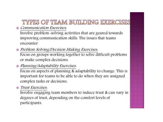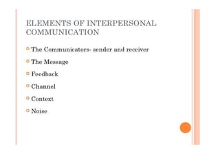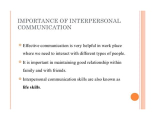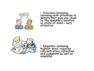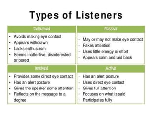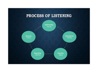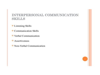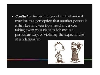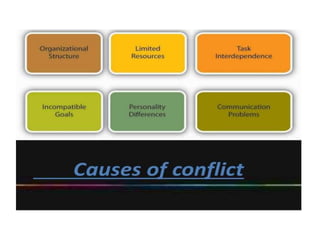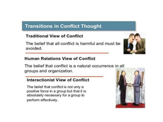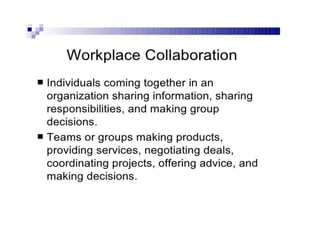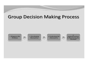 This document discusses various types of interpersonal communication including verbal, written, nonverbal, and intercultural communication. It also discusses listening as an active process of receiving, interpreting, and reacting to messages from the communication sender. Several barriers to effective listening are outlined such as inadequate background information, selective perception, and distractions. Collaboration in the workplace is defined as groups working together through idea sharing to accomplish common goals. Effective decision making techniques for teams include brainstorming, the nominal group technique, and the Delphi technique. Models of organizational conflict include Pondy's five stage model of latent, perceived, felt, manifest, and aftermath conflicts.