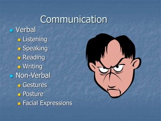 This document discusses interpersonal skills in the workplace, including communication skills like listening, speaking, and providing feedback. It addresses both positive skills like constructive feedback and respectful conflict resolution, as well as negative behaviors like discrimination, unethical conduct, and destructive feedback. The document provides guidance on developing effective interpersonal interactions with coworkers through diversity, respect, proper handling of issues, and leadership.