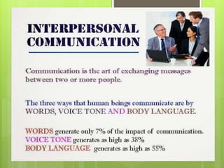 This document defines and discusses interpersonal communication. It notes that interpersonal communication involves transmitting feelings, ideas, emotions, and information between two people in direct contact, whether verbally or nonverbally. Key elements of interpersonal communication are the communicator (sender and receiver), the message being conveyed, noise that can distort the message, feedback from the receiver, the context of the interaction, and the channel used to transmit the message. Examples of interpersonal exchanges are also provided to illustrate these elements.