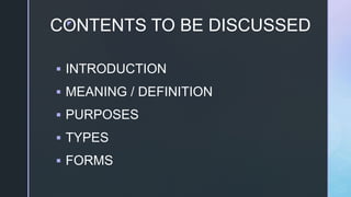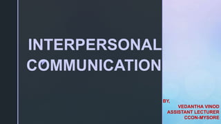 This document discusses interpersonal communication. It defines interpersonal communication as communication between two or more people face-to-face. The document outlines several purposes of interpersonal communication, including conveying and receiving information, maintaining relationships, and solving problems. It also describes different types of interpersonal communication, such as direct, mediated, mass, and transpersonal communication. Finally, the document discusses forms of interpersonal communication and Knapp's relationship model, which explains how relationships develop and end.