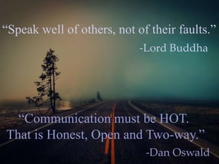 This document discusses interpersonal communication and interpersonal skills. It defines interpersonal communication as the process by which people exchange information through verbal and non-verbal messages. Some key components of interpersonal communication are communication skills, verbal communication, assertiveness, non-verbal communication, and listening skills. It also outlines four principles of interpersonal communication: it is inescapable, irreversible, complicated, and contextual. Additionally, the document discusses gateways to effective interpersonal communication such as transparency, using multiple communication channels, clarity in communication, and feedback. It emphasizes the importance of interpersonal skills like communication, active listening, conflict resolution, and maintaining emotional balance when developing good interpersonal skills.