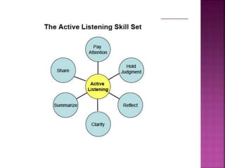 Interpersonal communication involves ongoing interactions between individuals where they treat each other as unique, distinguishing it from impersonal communication. It encompasses both functional messages, focused on practical information, and nurturing messages, which express care and value in the relationship. Essential skills for effective interpersonal communication include active listening, personal sharing, and adapting communication to maintain and foster relationships.