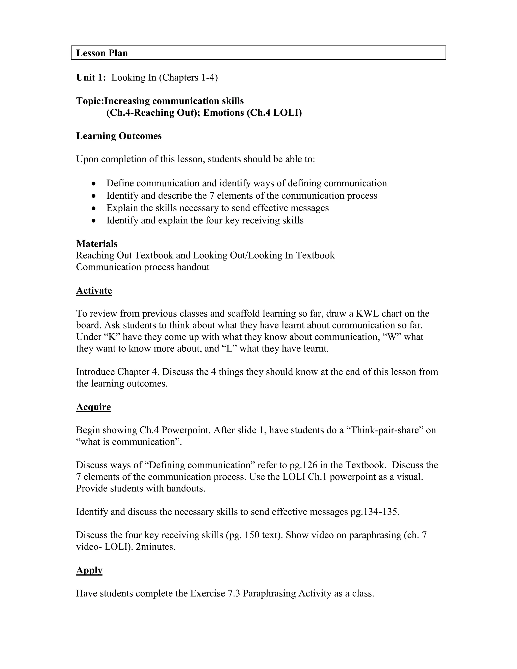 This lesson plan summarizes a unit on communication skills that will take place over 4 chapters. Students will learn to define communication, identify the 7 elements of the communication process, explain skills for sending effective messages, and identify 4 key receiving skills. The lesson will start with a review activity using a KWL chart. It will then introduce the chapter and learning outcomes before using presentations and handouts to discuss defining communication, the communication process, sending skills, and receiving skills. An activity paraphrasing exercise will allow students to apply their learning.