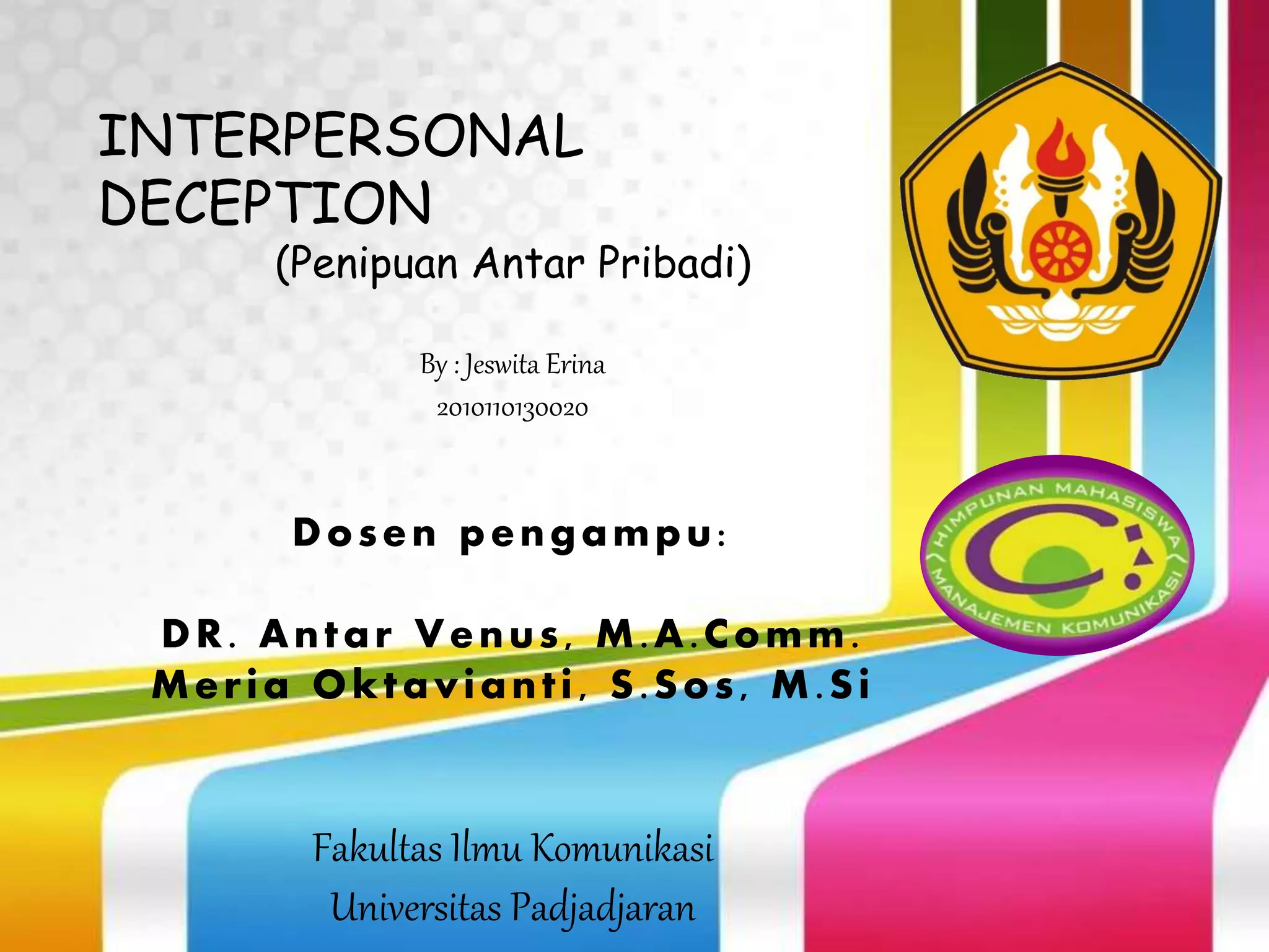 Teori penipuan antar pribadi mengemukakan bahwa kebohongan digunakan untuk menghindari menyakiti orang lain atau untuk melindungi citra diri. Teori ini, yang dikembangkan oleh David Buller dan Judee Burgoon, menjelaskan berbagai bentuk dan motivasi di balik penipuan, serta tanda-tanda komunikasi nonverbal yang dapat mengindikasikan kebohongan. Kebohongan dianggap sebagai bagian dari interaksi sosial yang umum dalam komunikasi antar individu.
