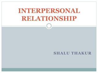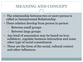 Interpersonal relationships refer to associations between two or more individuals that are based on social, cultural, and personal factors. There are several types of interpersonal relationships including intimate relationships, family relationships, and business relationships. Continuing interpersonal relationships typically progress through five stages - acquaintance, build-up, continuation, deterioration, and termination. The stages involve developing trust and compatibility during the build-up phase, committing to a long-term relationship during continuation, barriers causing a downfall during deterioration, and ultimately ending the relationship.