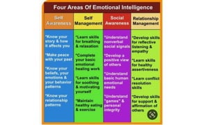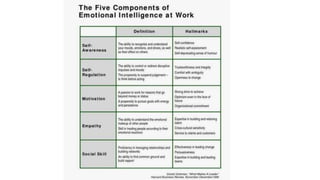 Interpersonal skills, also known as soft skills or social intelligence, become increasingly important as one enters the workplace. Even if someone excels technically, poor interpersonal skills will negatively impact how they are perceived. Emotional intelligence involves understanding and managing one's own emotions and those of others. It can be developed through self-awareness, self-regulation, motivation, empathy, social skills, and relationship management. Employers value emotional intelligence as it relates to employee engagement, adaptability to change, idea generation, and overall business success.