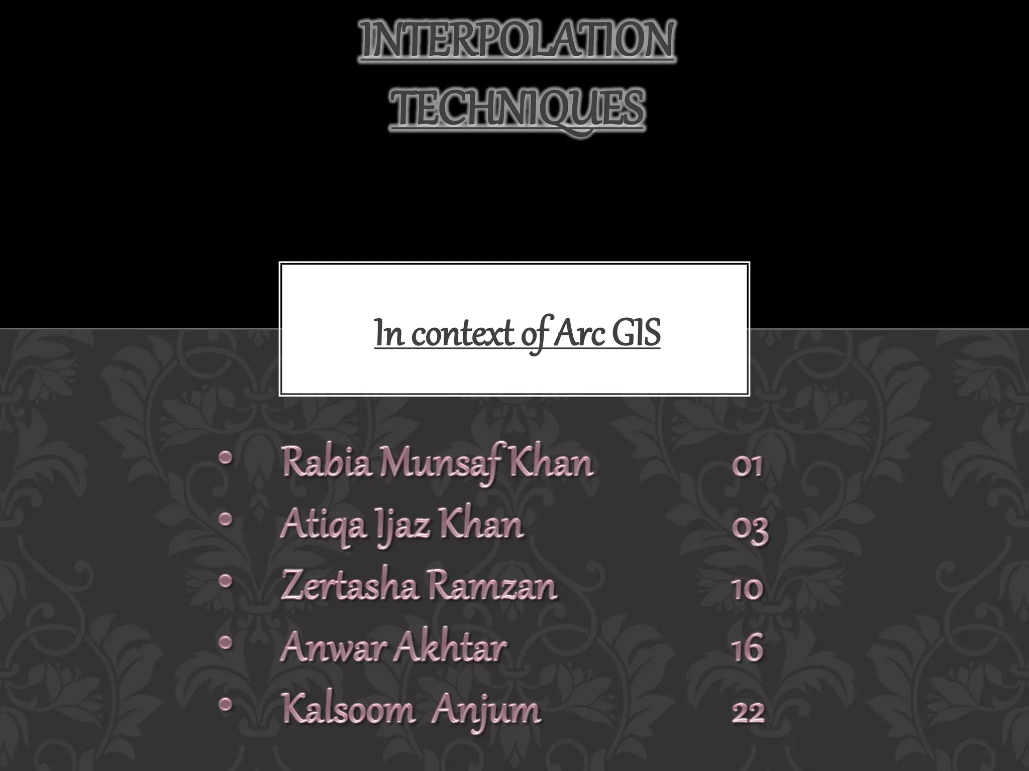 The document discusses various interpolation techniques used in GIS, including inverse distance weighted (IDW), spline, and kriging. IDW, spline, and kriging were analyzed in more depth. The study area includes states in the western US and weather station data was used, including station names, coordinates, elevation, and rain percentage. Different interpolation techniques were tested in ArcGIS and ArcScene to compare the results.