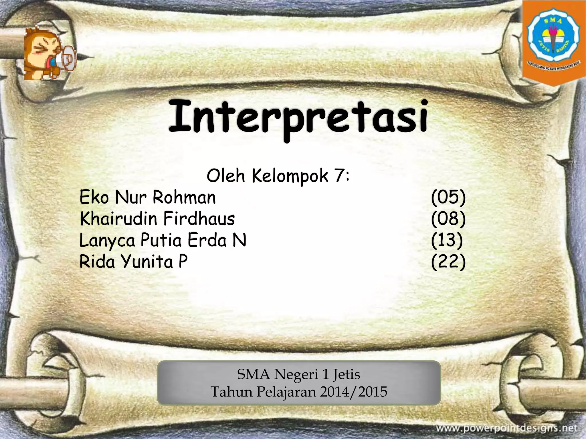 Dokumen ini membahas tentang interpretasi dalam sejarah, termasuk pengertian, sifat, tujuan, dan perbedaan sudut pandang dalam menafsirkan peristiwa sejarah. Terdapat dua jenis interpretasi yaitu analisis dan sintesis, yang masing-masing bertujuan untuk menguraikan dan menyatukan data sejarah. Selain itu, keberhasilan interpretasi bergantung pada keterampilan sejarawan dalam membaca dan memahami sumber-sumber yang digunakan.