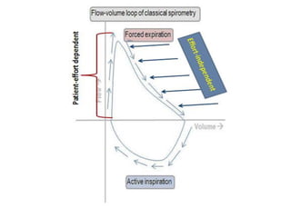 PFTs measure lung function through tests of ventilation, gas exchange, ventilation control, and exercise response. Key measurements include FEV1, FVC, FEV1/FVC ratio, DLCO, and arterial blood gases. PFT results are interpreted to identify obstructive, restrictive, or combined patterns and determine the severity of lung abnormalities.