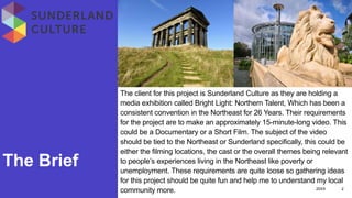 The client is Sunderland Culture who is holding a 26-year long media exhibition called Bright Light: Northern Talent. They are requesting a 15-minute documentary or short film on a topic tied to the Northeast of England or Sunderland specifically. The film could focus on the filming locations, cast, or themes relevant to people in the Northeast like poverty or unemployment. The intended audience is people aged 16-25 as the creator falls in that age bracket. There is an April 2024 deadline for the initial submission and a June 2024 deadline for resubmissions, allowing plenty of time to create the best possible product.