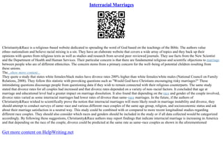 The document discusses a religious website called Christianity&Race that believes interracial marriage is a sin. The website uses quotes from religious texts and peer-reviewed studies to argue that interracial marriages have higher divorce rates and risks to potential children. However, the studies they cite do not conclusively prove that interracial marriages are less stable, as factors like age and education also impact divorce rates. The website could better study how satisfaction varies in same-race and interracial marriages of similar demographics over time.