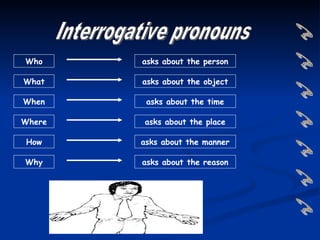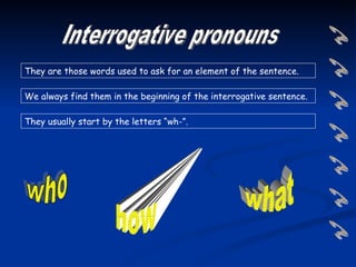 This document discusses interrogative words known as "wh-" words that are used to ask questions. It notes that these words are found at the beginning of interrogative sentences and usually start with letters "wh-". It then lists common interrogative words like who, what, when, where, how and why and explains what type of information each asks about, such as person, object, time, place, manner or reason. It provides examples of questions using these interrogative words.
