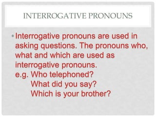 This document discusses interrogative pronouns in English and provides examples of their correct usage. It focuses on who, whom, whose, who's, what, and which. Key points covered include: