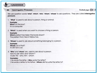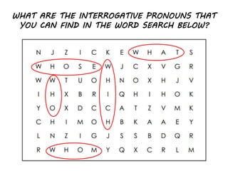 The document discusses interrogative pronouns that can be found in a word search puzzle. It lists the interrogative pronouns as who, whose, whom, what, when, and where. It then provides examples of sentences using these interrogative pronouns, such as "Where is the book?" and "Who is the new girl in our class?".