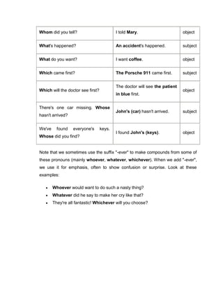 This document discusses interrogative pronouns which are used to ask questions. The main interrogative pronouns are who, whom, what, which, and whose. It provides examples of questions using these pronouns and the answers indicating what noun each interrogative pronoun represents. It also notes that whom is used as the object of a verb and that "-ever" can be added for emphasis when asking questions expressing confusion or surprise.