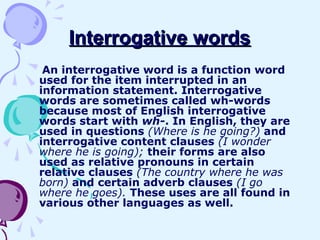 This document discusses different types of interrogative words in English including interrogative sentences, adverbs, adjectives, and pronouns. It provides examples of each type. Interrogative sentences are questions that use helping verbs like "does" and "are". Interrogative adverbs ask about time, place, manner, quantity or reason using words like "how", "when", and "why". Interrogative adjectives include words like "which" and "what" used along with nouns. Interrogative pronouns are words like "who", "whose", and "what" used to ask questions. Finally, it lists common wh-words in English and provides examples of questions using them.