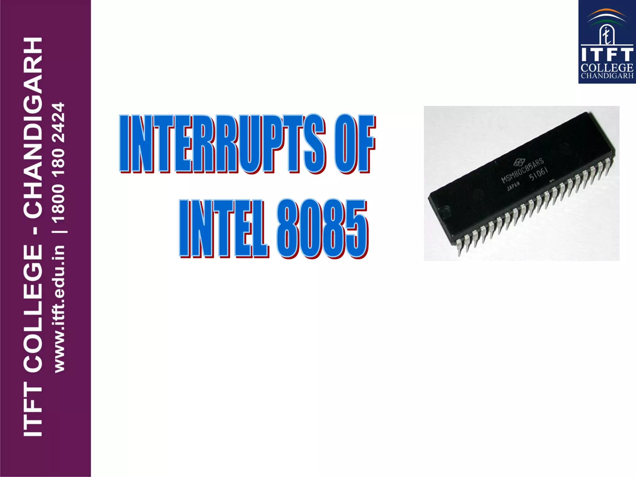 An interrupt pauses the normal execution of a microprocessor. When an interrupt occurs, the program counter is saved to the stack and interrupts are disabled. An interrupt acknowledge signal is sent and the service routine address is executed. After servicing, the original program counter is retrieved from the stack and execution resumes. There are hardware and software interrupts. Hardware interrupts come from I/O devices and software from CPU instructions. Interrupts can be maskable/non-maskable, vectored/non-vectored, edge/level-triggered, and have different priorities like the 8085's TRAP, RST 7.5, RST 6.5, RST 5.5, and INTR interrupts.