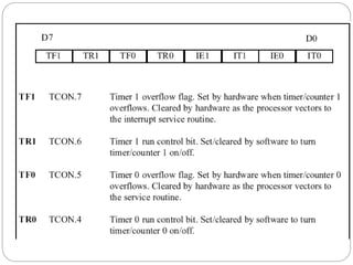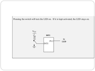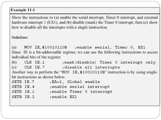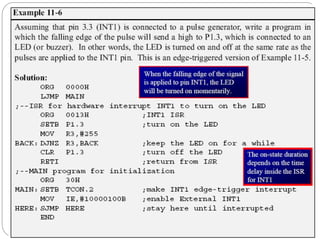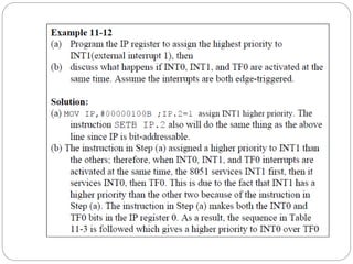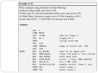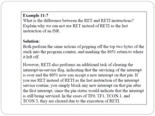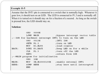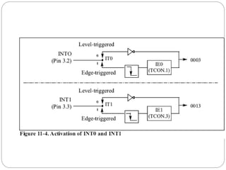 The document discusses interrupts in microcontrollers and compares interrupts to polling. It describes how interrupts allow a microcontroller to serve multiple devices simultaneously. When an interrupt occurs, the microcontroller saves its state and jumps to an interrupt service routine (ISR) to handle the interrupt. The document outlines the six interrupts in the 8051 microcontroller and how to enable, disable, and set the priority of interrupts. It also discusses timer, external hardware, and serial communication interrupts in detail.