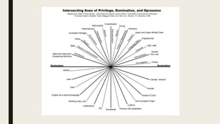 Intersectionality examines how social categories like race, class and gender intersect and impact experiences of both individuals and groups. Intersectional feminism aims to be inclusive of marginalized women by considering these intersecting identities. It seeks to give voice to women who have been excluded from mainstream feminism and create a more compassionate world through understanding different experiences. Advocating for intersectional feminism involves understanding one's own and others' social positions, showing respect for all people, helping those in need, volunteering with organizations assisting marginalized groups, and demonstrating compassion even when facing disagreement.