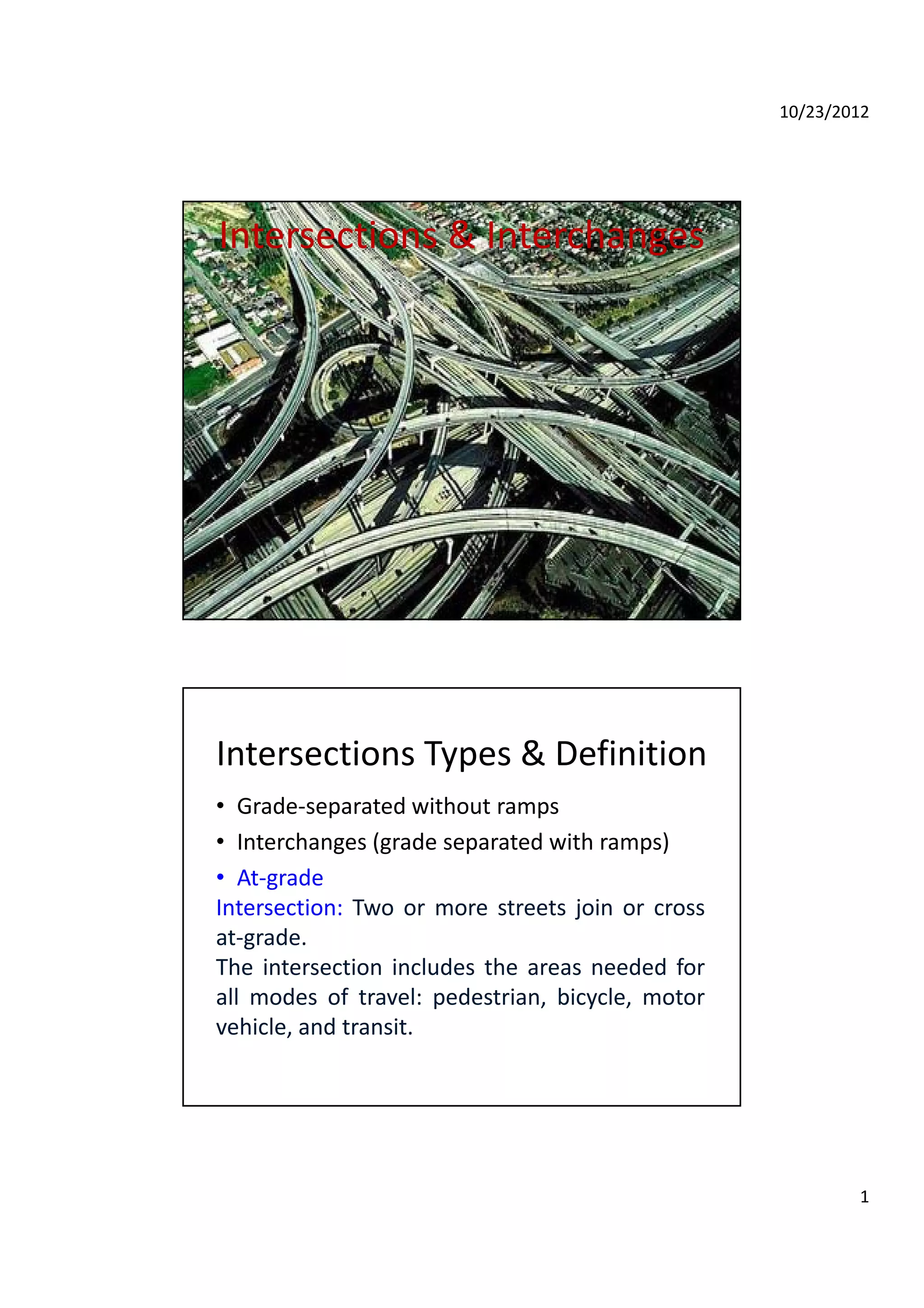 This document discusses different types of intersections and interchanges, including their key elements and design considerations. It describes at-grade intersections, channelization techniques, and different interchange configurations like diamonds, cloverleafs, and trumpets. The document also covers factors in curb radius, turn lane, and sight distance design, and provides examples of determining sufficient sight distance at intersections.