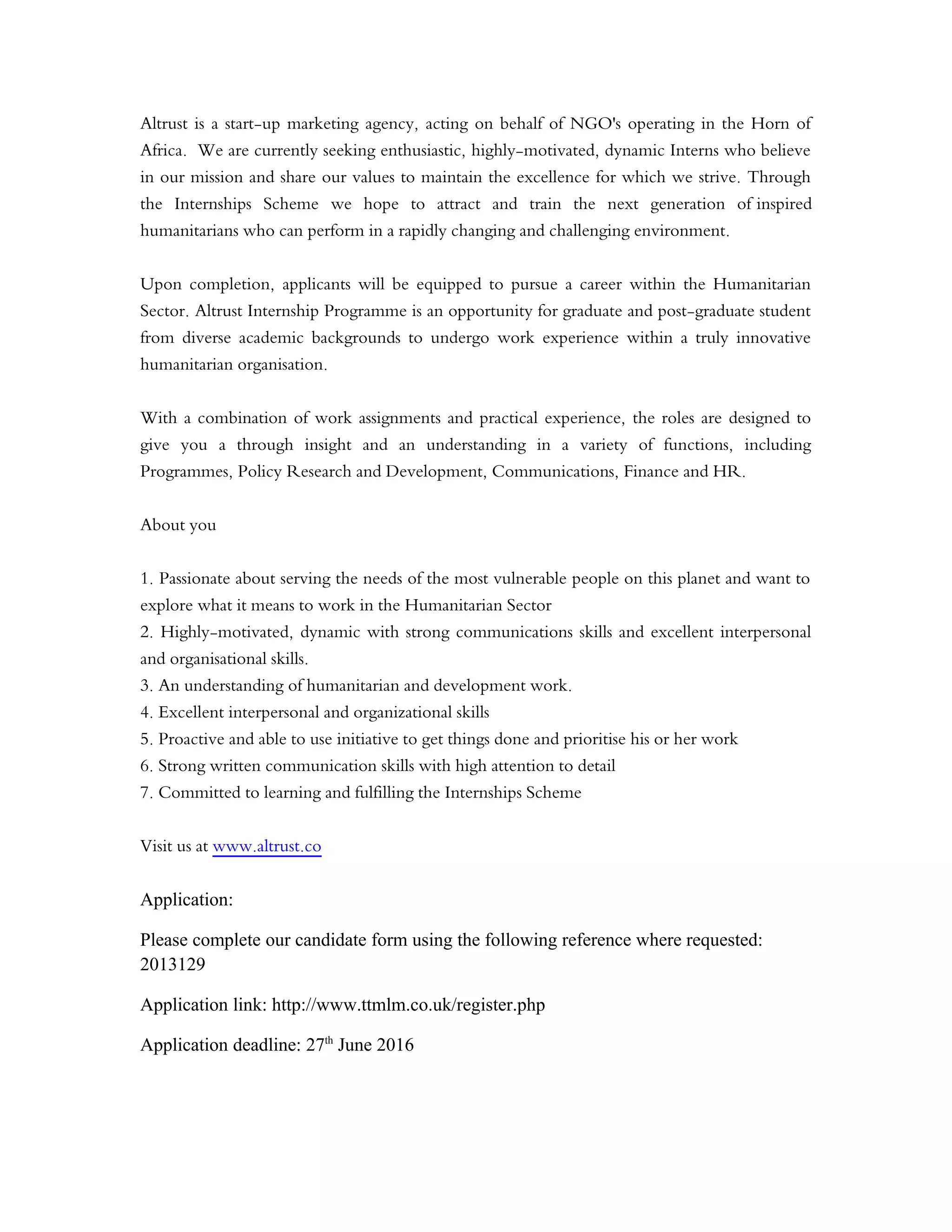 Altrust is a marketing agency seeking interns to support NGOs in the Horn of Africa. Their internship program aims to attract and train the next generation of humanitarians through hands-on experience in programs, communications, finance and HR. Successful applicants will have a passion for humanitarian work, strong communication skills, initiative and the ability to multi-task. The deadline to apply is June 27th.