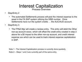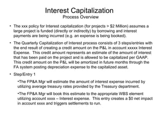 The document describes a company's policy and process for quarterly capitalization of interest for large projects over $2 million that are funded by borrowing. It involves three steps: 1) estimating interest expense and booking it, 2) an automated system posting the expense to assets, and 3) a reclass entry debiting a non-op account and crediting interest expense to track amounts capitalized. Key roles include Treasury calculating interest rates, FP&A booking entries, and fixed asset accounting ensuring proper asset assignment.