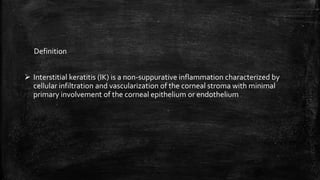 Interstitial keratitis, also known as stromal keratitis, is a non-suppurative inflammation of the corneal stroma that can be caused by both infectious and non-infectious diseases. It is characterized by cellular infiltration and vascularization of the corneal stroma with minimal involvement of the corneal epithelium or endothelium. Congenital syphilis is a classic cause of interstitial keratitis. Stromal keratitis associated with congenital syphilis typically begins between ages 5-15, presents bilaterally, and can lead to diffuse corneal inflammation, edema, and neovascularization if left untreated. Acquired syphilis less commonly causes unilateral stromal keratitis, which