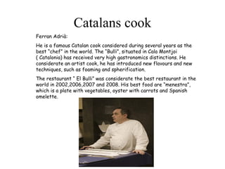 The document discusses four famous international chefs - two from Catalonia and two from Spain. It provides details about each chef's background and training. It highlights some of their most famous and popular dishes, including Ferran Adrià's "menestra" and Santi Santamaria's "Broccoli grated with yoghurt and fish eggs". José Andrés is noted for his tapas, especially octopus and squid dishes. Dario Barrio began cooking at a young age and has won several awards for his contributions to gastronomy.