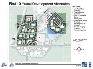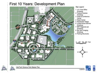 The document outlines the Intertech Science Park project in Shreveport, which aims to create a tech hub that supports various businesses and fosters a vibrant community. It includes plans for infrastructure development, funding, collaboration with local organizations, and a focus on public transportation, housing, and environmental considerations. The project's vision is to enhance the local economy by generating jobs and nurturing a dynamic cultural scene centered around technology and southern music traditions.