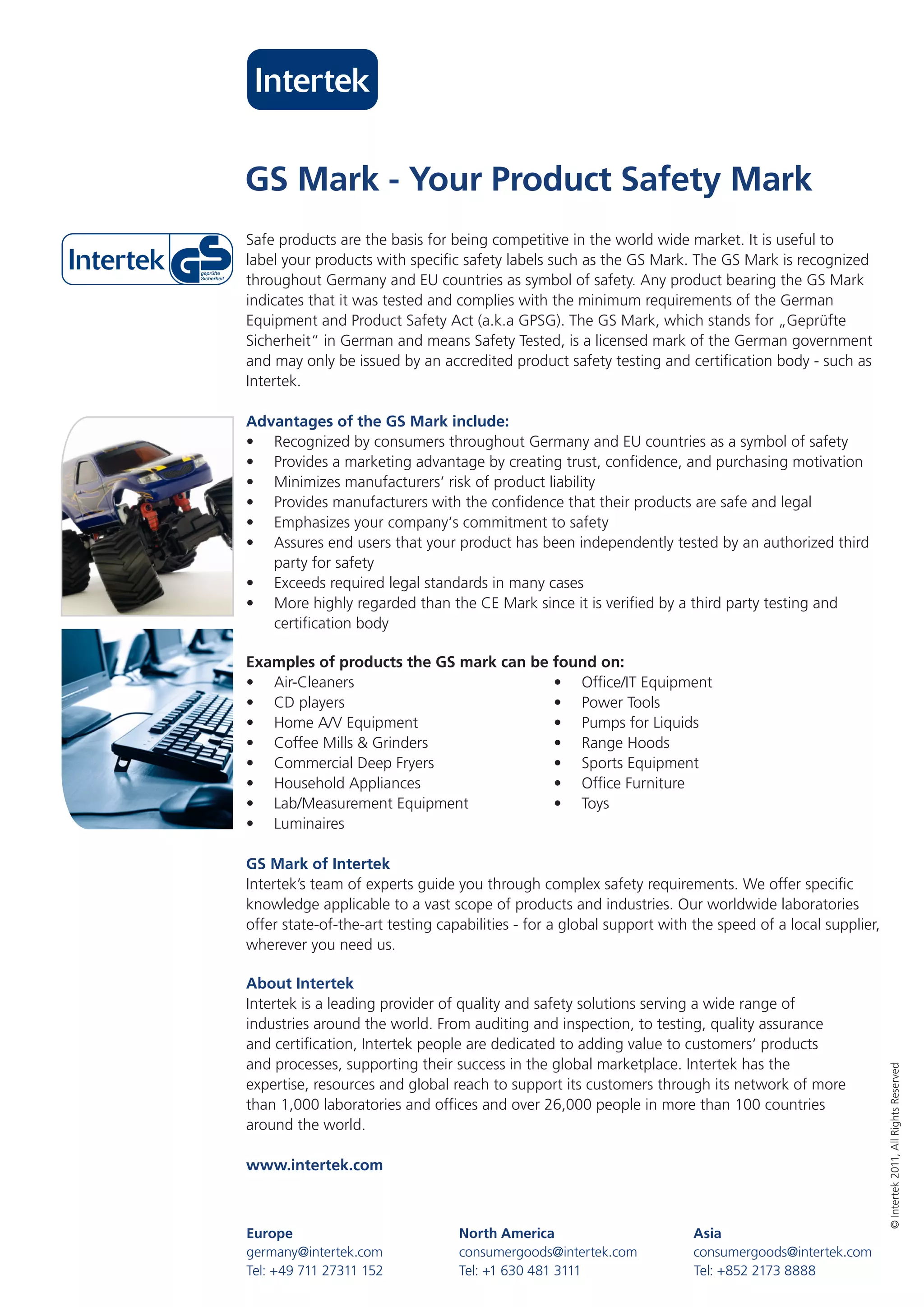 The GS Mark is a product safety label recognized throughout Germany and EU countries that indicates a product has passed testing and complies with German safety standards. It can only be issued by accredited certification bodies like Intertek, and provides advantages like minimizing liability, assuring safety, and being more highly regarded than the CE Mark. The GS Mark from Intertek can be found on a wide range of consumer and industrial products, and Intertek offers global support and testing capabilities for the certification.