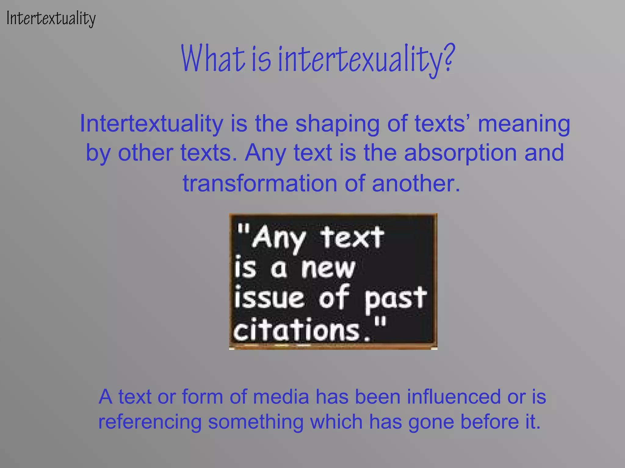Intertextuality refers to how texts influence each other through references and transformations. It occurs when a text references or is inspired by previous media or ideas. The music video for "Take On Me" uses comic book references as intertextuality, referencing a previous form of media. Similarly, Shania Twain's "Man! I Feel Like A Woman" music video was clearly inspired by Robert Palmer's earlier "Addicted to Love" video as an example of intertextuality, taking influences from one text to create another.