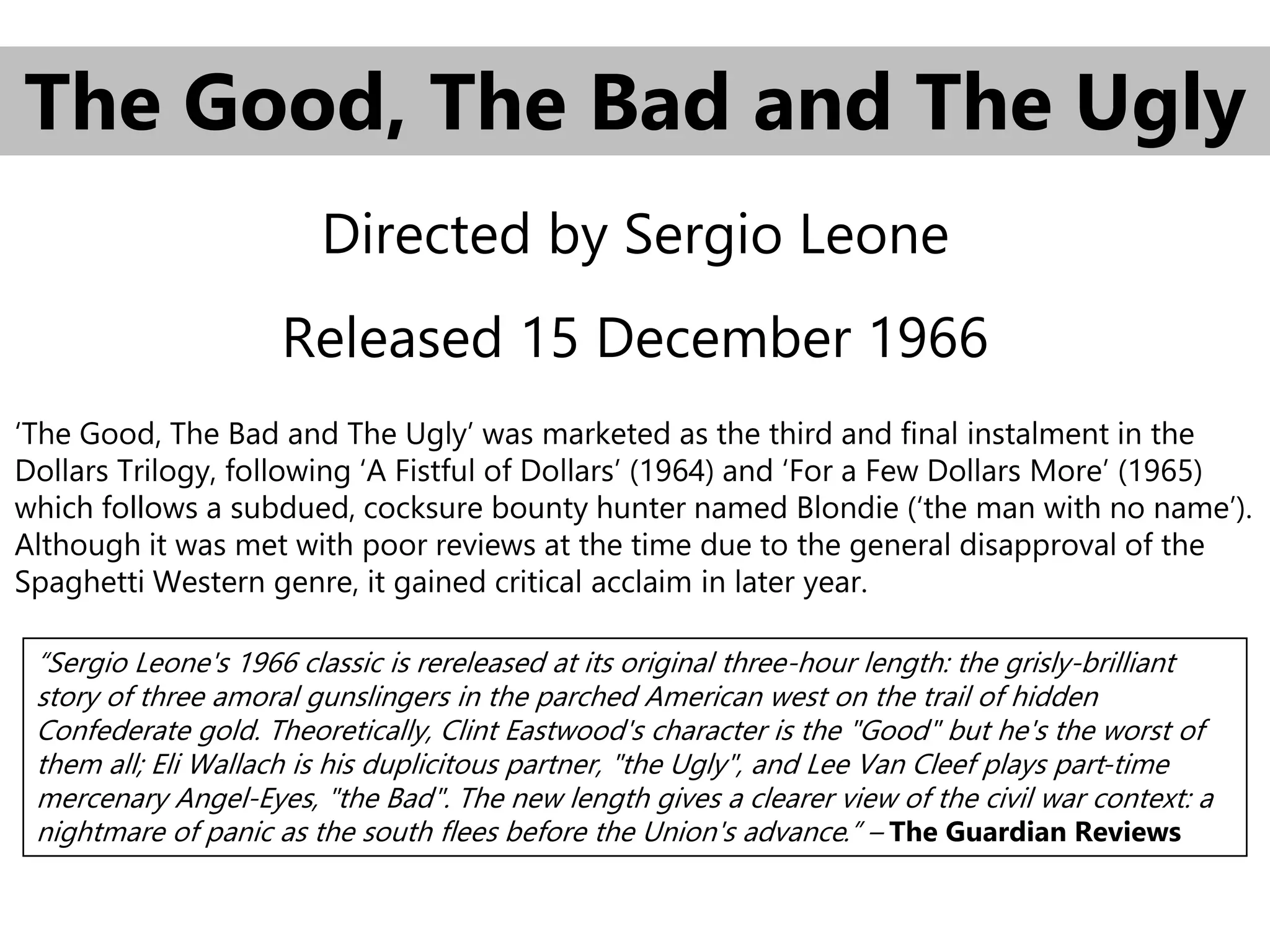 The document discusses intertextuality between Quentin Tarantino's 2004 film Kill Bill: Volume 2 and Sergio Leone's 1966 film The Good, the Bad and the Ugly, as well as Leone's 1964 film A Fistful of Dollars. It notes four main references: 1) the use of soundtrack music from A Fistful of Dollars, 2) the isolated locations near the Mexican border featured in both films, 3) the use of close-ups during climactic scenes, and 4) the characterization of protagonists as "the Good" and antagonists representing "the Bad" and "the Ugly". The analysis suggests Tarantino drew inspiration from the classic spaghetti Wester