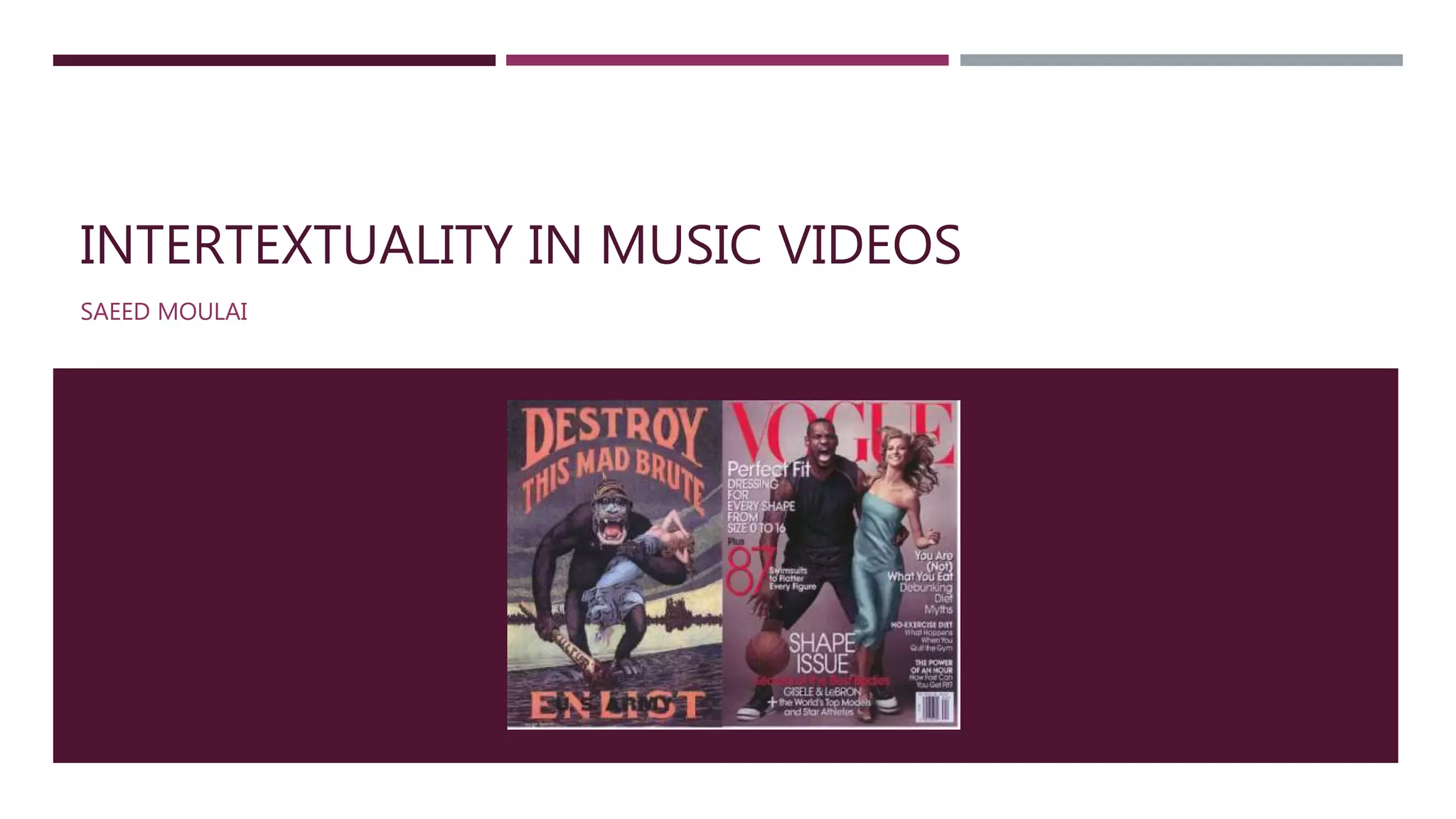 Intertextuality refers to how one media text references another. Music videos often use intertextuality to be humorous or increase popularity by appealing to fans of the referenced text. An example is Robbie Williams' "You Know Me" video, which references Alice in Wonderland by dressing Robbie as the White Rabbit and including backup dancers as the Queen of Hearts in the same settings from the film. Other music video examples that use intertextuality include Iggy Azalea's "Fancy" referencing Clueless, Taylor Swift's "Love Story" referencing Romeo and Juliet, and Eminem's "Just Lose It" referencing MC Hammer's "Can't Touch This".