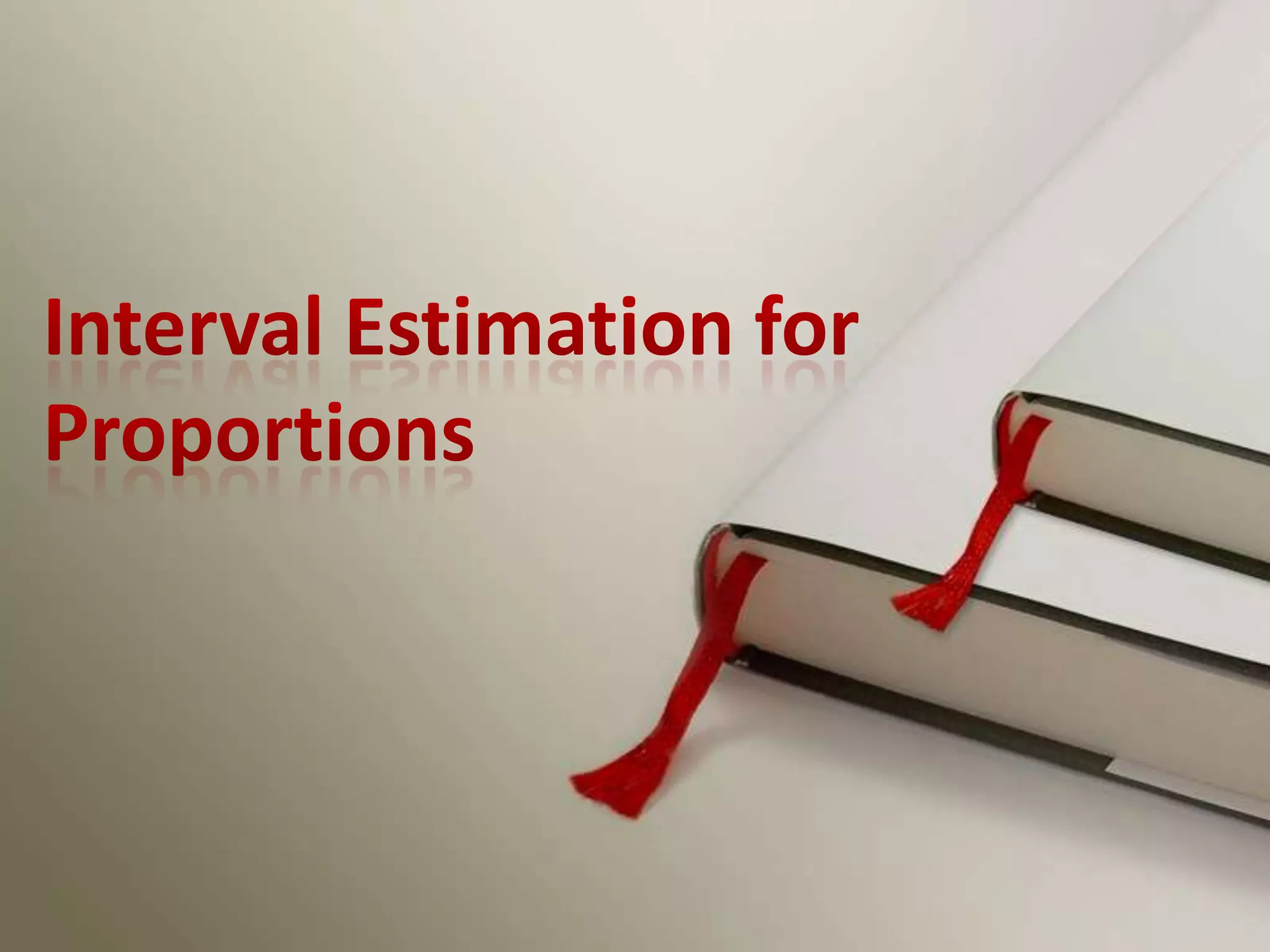 This document discusses interval estimation for proportions. It defines point estimates and interval estimates. A point estimate is a single value of a statistic used to estimate a population parameter, like the sample proportion p estimating the population proportion P. An interval estimate provides a range of values between which the population parameter is expected to lie with a certain confidence level, like a 95% confidence interval for a proportion. Two examples are provided to demonstrate how to calculate a confidence interval for a sample proportion and interpret whether it supports or contradicts a claimed population proportion.