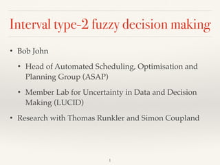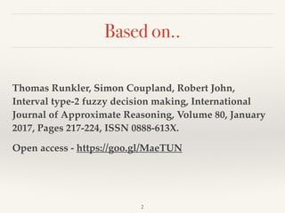 This document discusses interval type-2 fuzzy decision making, focusing on decision making under uncertainty and the integration of risk in the decision process. It presents methods for evaluating decisions that consider both worst-case and best-case scenarios, allowing for varying levels of risk in achieving optimal results. The findings propose that explicitly accounting for risk can enhance decision quality by 5.3-8.1%, particularly illustrated through traffic management applications.