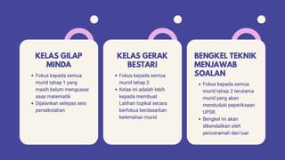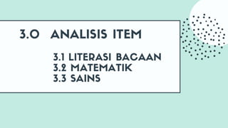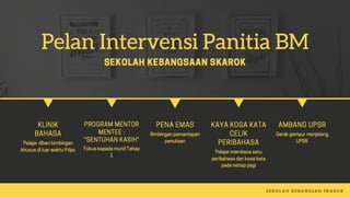Dokumen ini membentangkan pencapaian murid di SK Skarok dari segi literasi bacaan, matematik, dan sains untuk tahun 2021, serta program intervensi yang dilaksanakan. Pencapaian menunjukkan 100% murid dari tahun 5 dan 6 mencapai skor minimum yang ditetapkan, dengan pelbagai program untuk mempertingkatkan penguasaan ilmu. Intervensi termasuk kelas tambahan, program mentor mentee, dan teknik pengajaran untuk meningkatkan kemahiran sains dan matematik.